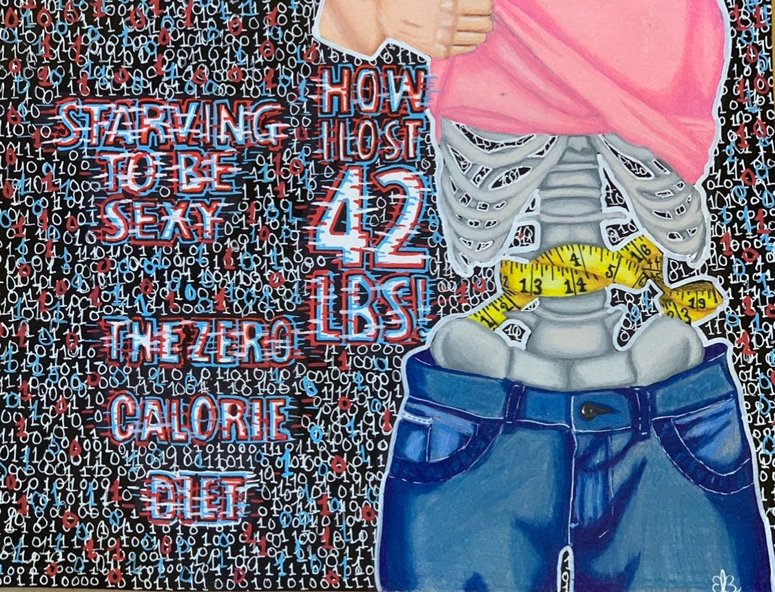 This piece is a visualization of Anorexia, which is an eating disorder. I wanted to represent how the unrealistic body standards in the media can impact someone’s mental health, which I did through the glitching text and coding. the coding can actually be seen as a double meaning because people suffering from more is can often be obsessed with numbers, whether that be number of calories, weight, how many times they allow themselves to eat, etc.