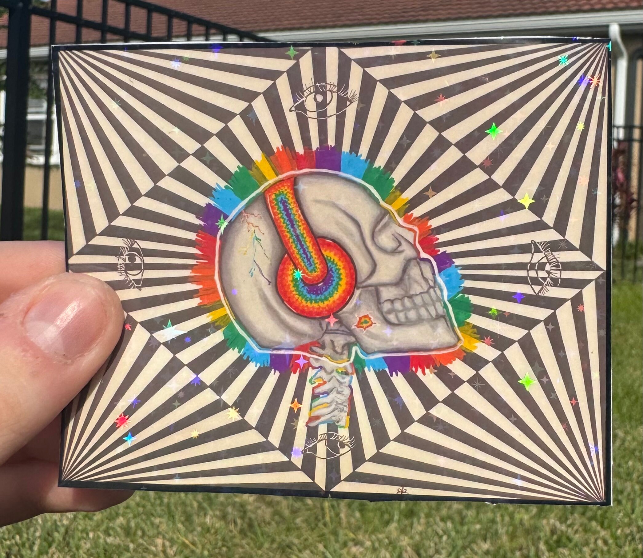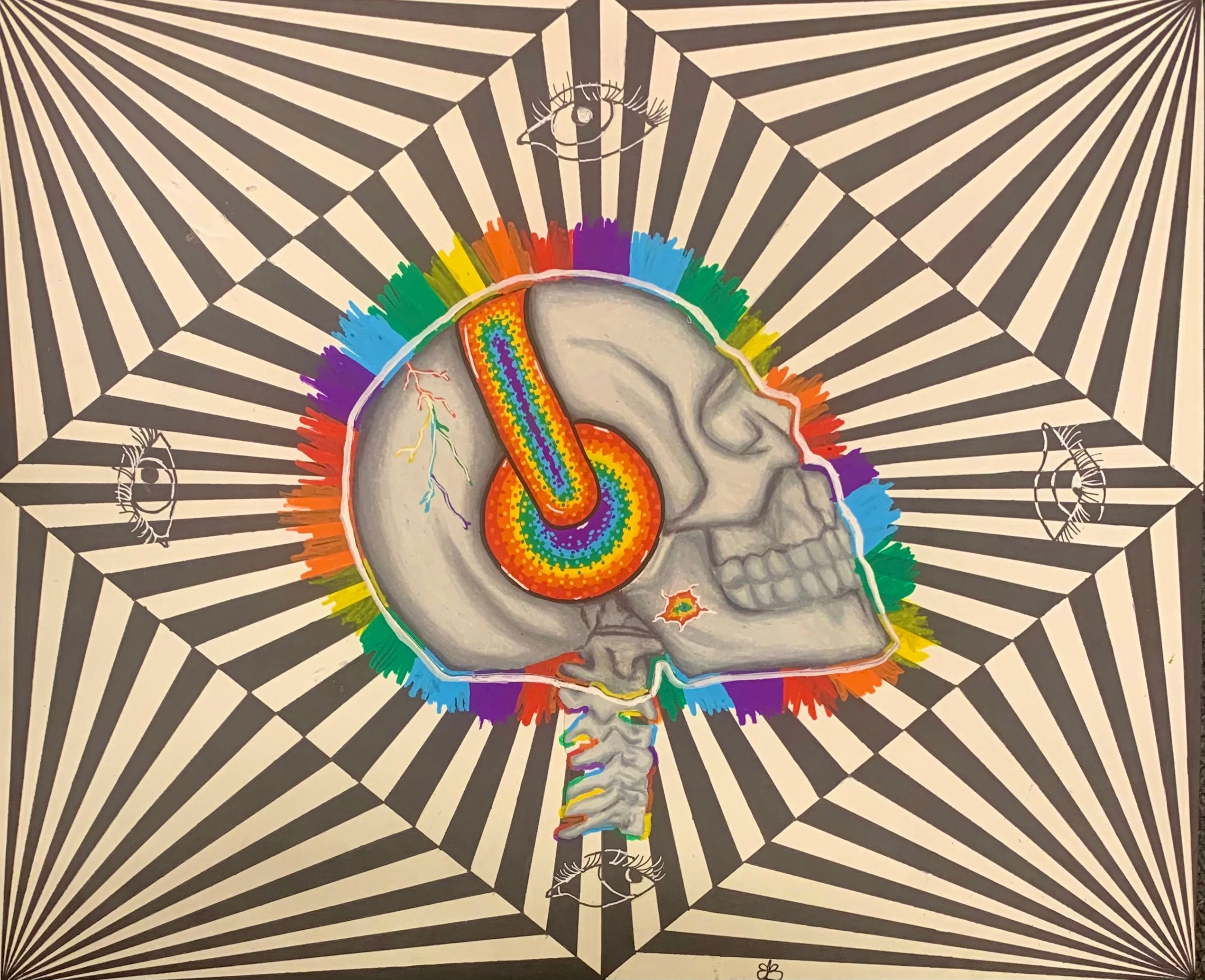 This piece is meant to represent the different symptoms a person with autism can experience. The headphones outline the sensory issues one can experience specifically with sounds. The illusion with the eyes symbolizes the struggle to make eye contact, as you can see none of the eyes are looking directly at you. Finally, the cracks in the skull represent the false stigma of autism being a disability, when in actuality it’s just a different ability.