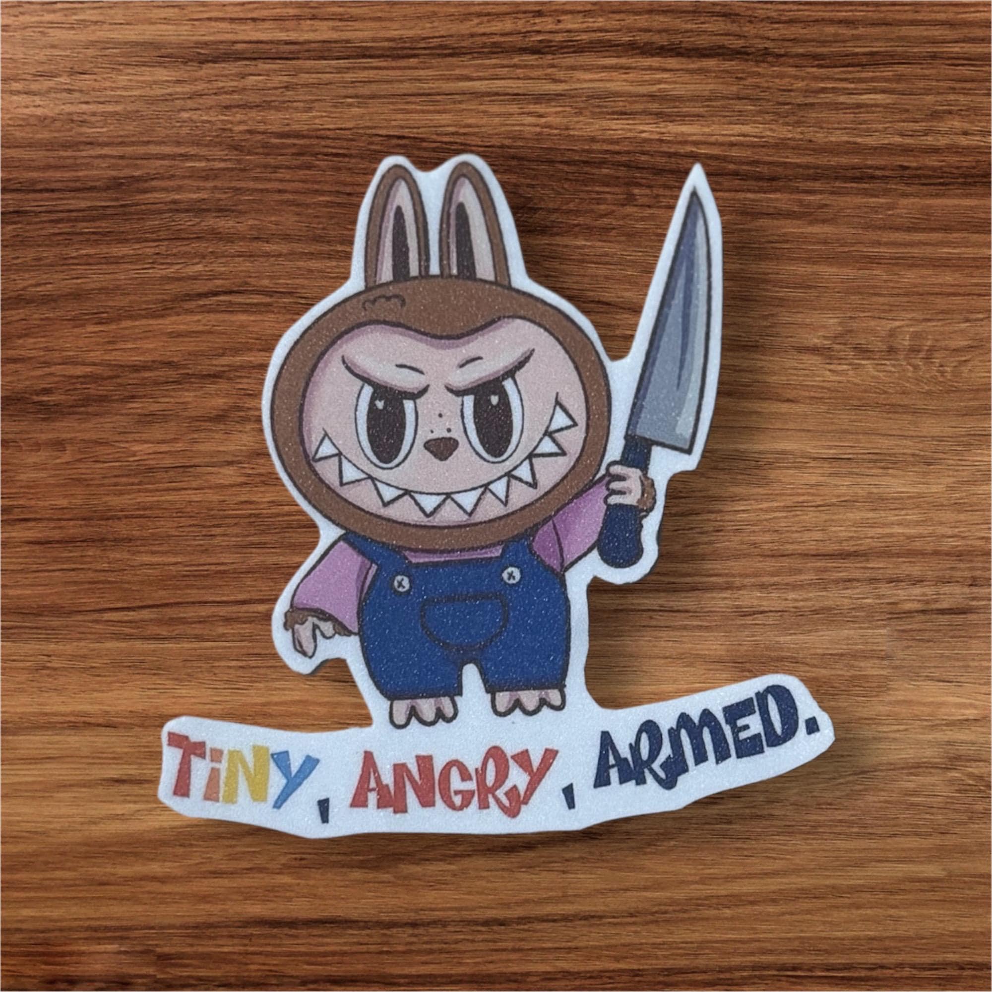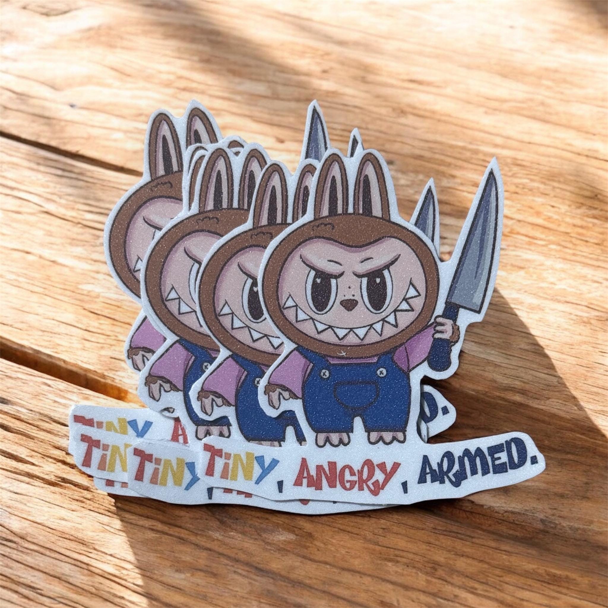 This handmade vinyl sticker features a fierce Labubu-inspired character—tiny, angry, and armed with a knife. Perfect for punk lovers, anti-fascist allies, and chaotic cuties alike, this bold design adds bite to any water bottle, laptop, sketchbook, or protest sign.